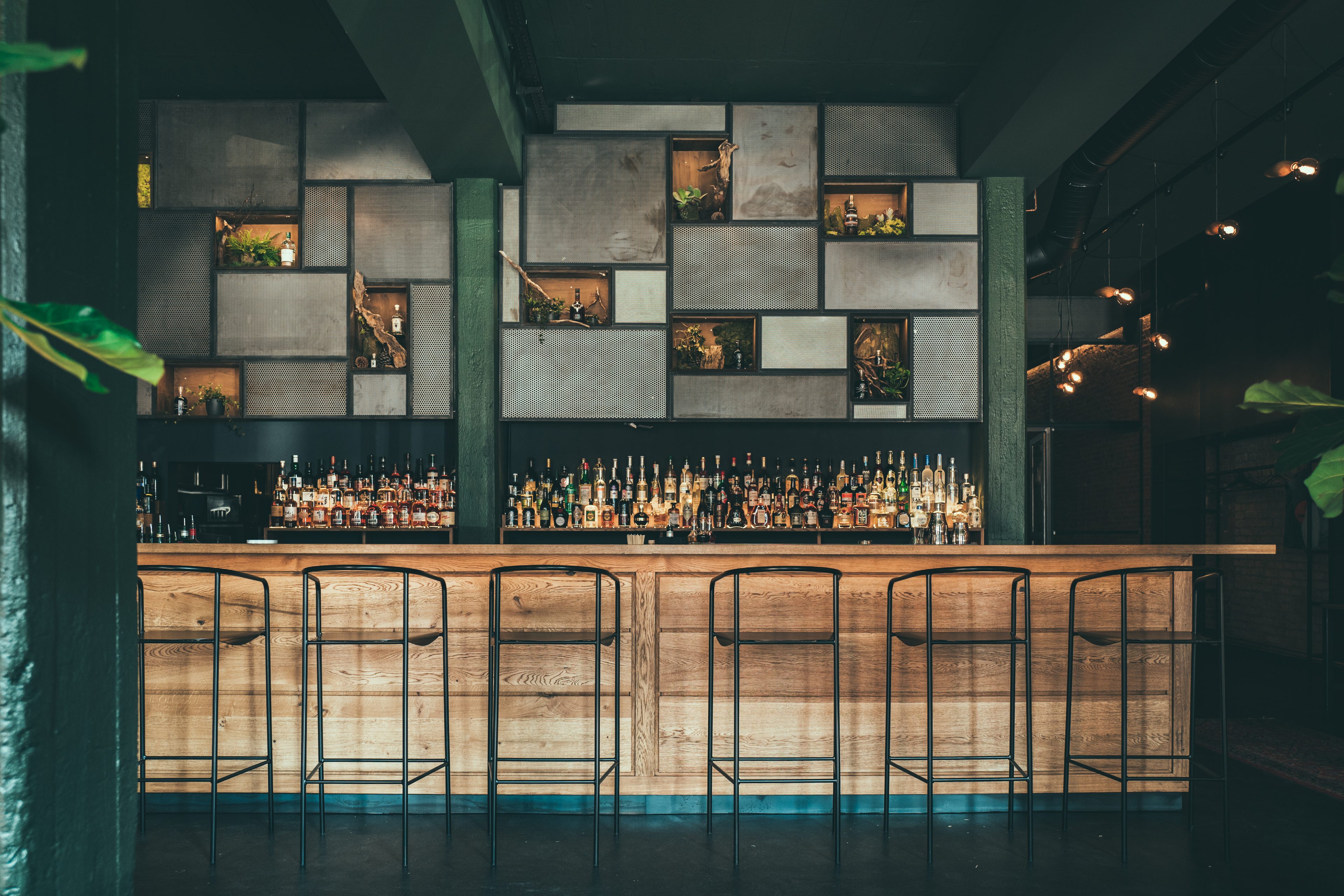 Am langen, aus Eichenholz gefertigten Tresen nimmt man Platz und blickt direkt auf die mit Moos bewachsene Rückwand, in der – natürlich – die eigenen Destillate präsentiert werden.
